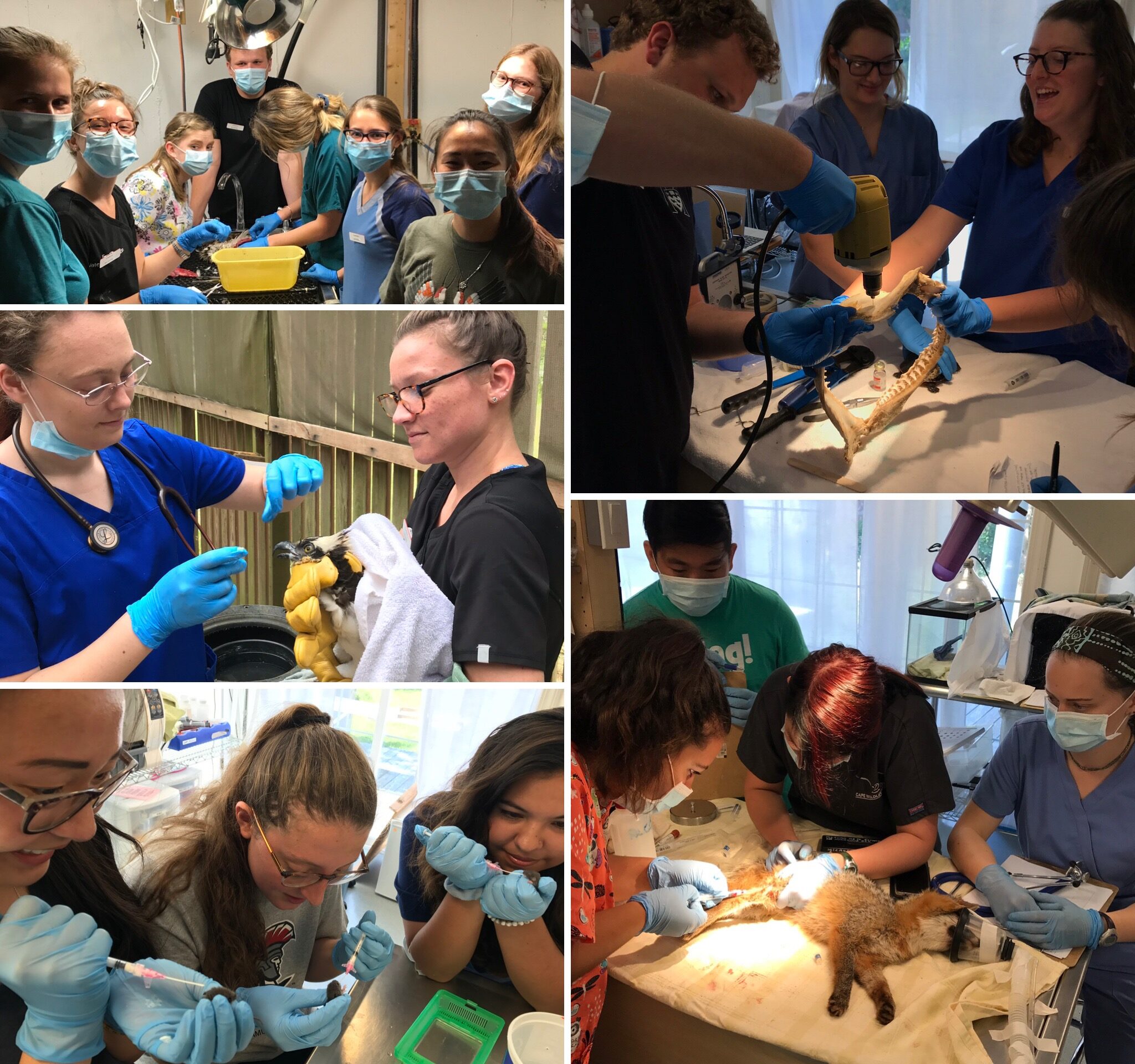 Pictured above are some of our past interns assist feeding an osprey, learning how to draw blood on a gray fox, practicing drilling for turtle shell repairs on a shark jaw, and syringe feeding orphaned mice. These are just some of the exciting experiences you will gain during your Internship!